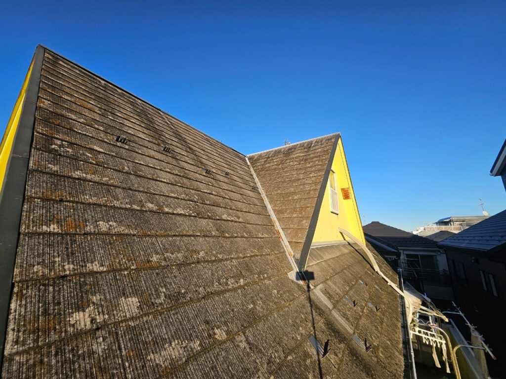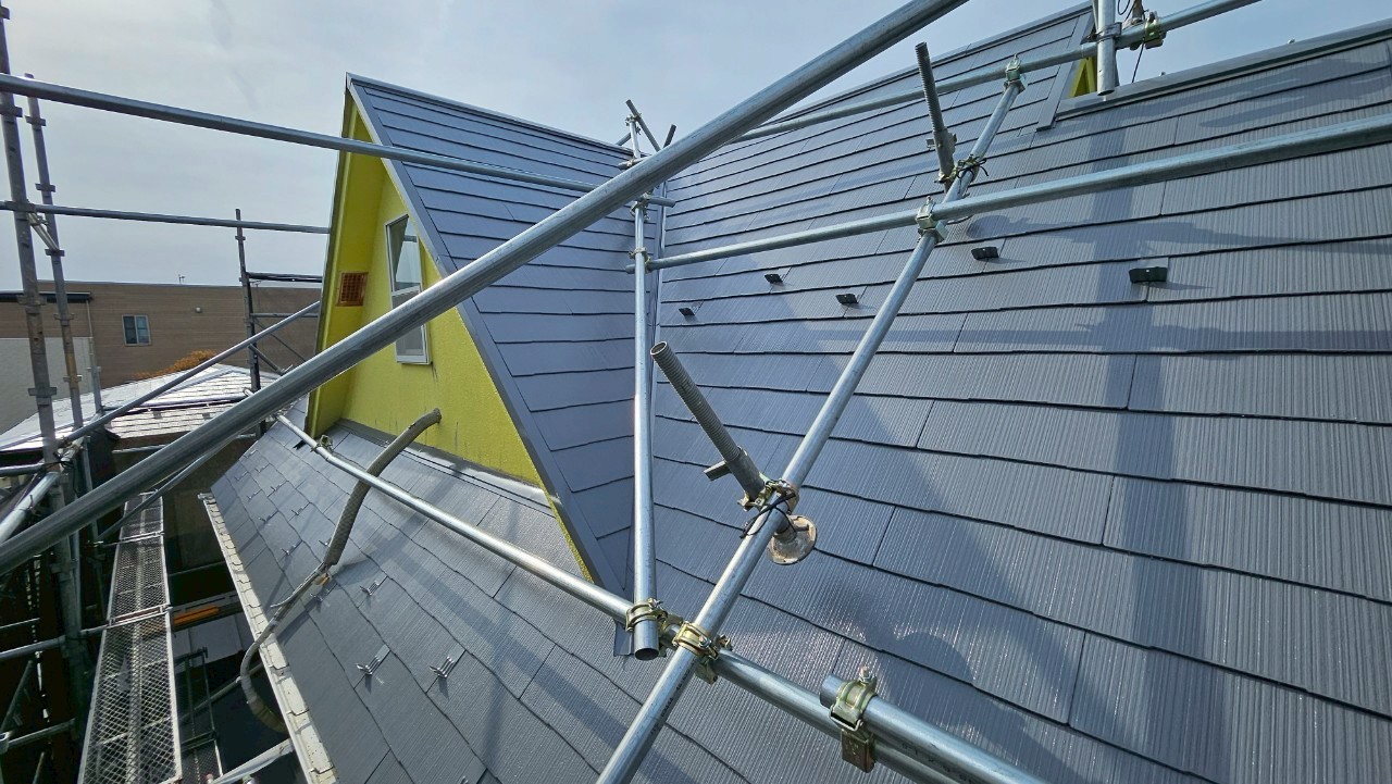 屋根の勾配があったため、屋根足場をかけさせて頂きました。